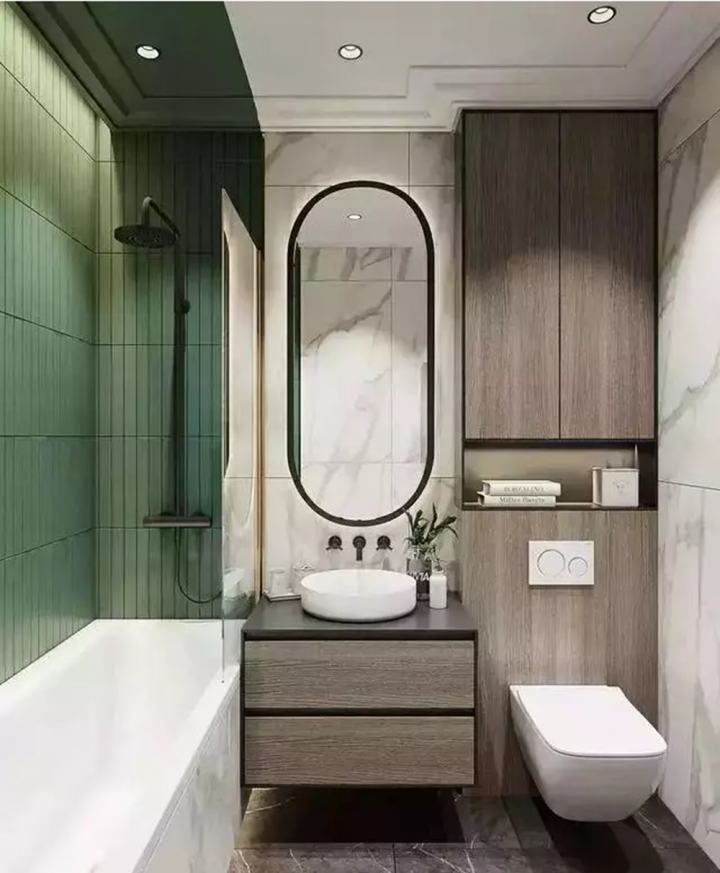 如果預算足夠,在裝修衛(wèi)生間時可以在馬桶后方設計一個收納柜,儲物空間增加,也能有效隔離水汽,防止一些日化用品受潮。