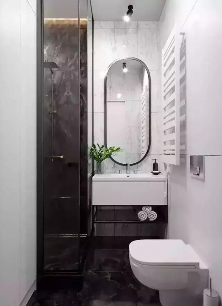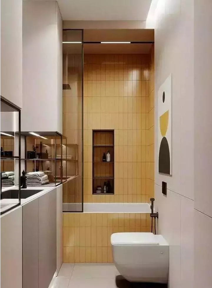 馬桶后上方是很多人會忽略的收納黃金區(qū)域,我們可以在這里安裝電熱毛巾架或是普通置物架。