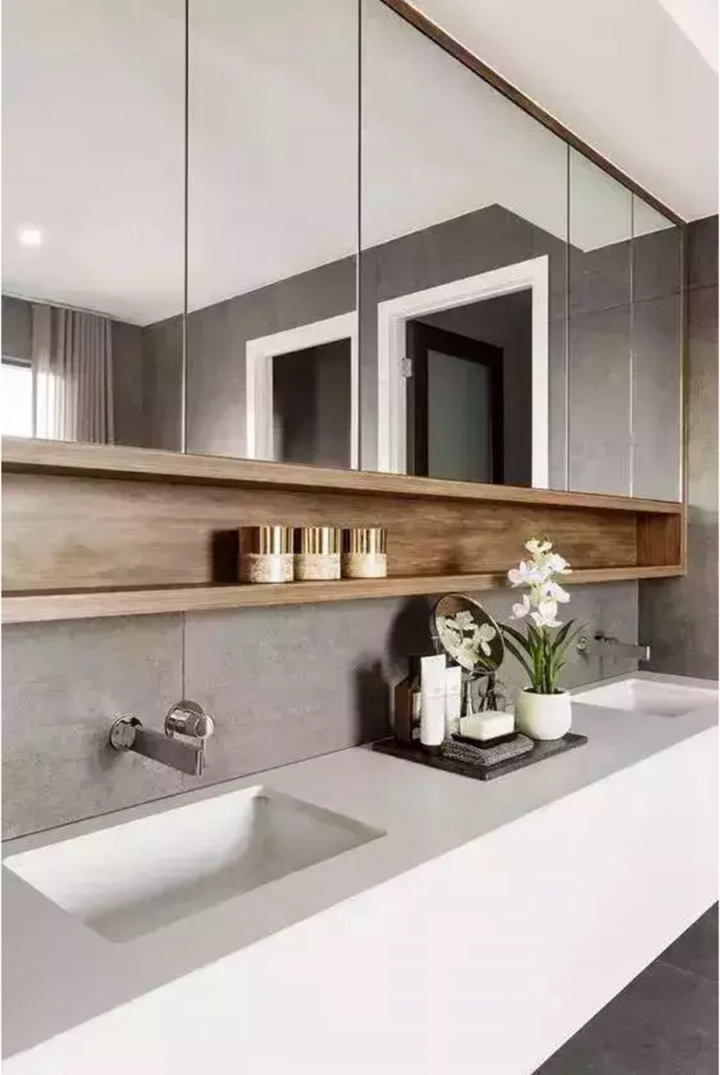 洗漱區(qū)的核心角色是洗臉臺,洗臉臺的上方、下方是把東西“藏起來”的好地方。一般而言,上方都會安裝便于梳洗的鏡子,我們可以用鏡面柜取代鏡子,一物兩用,利用率更高。
