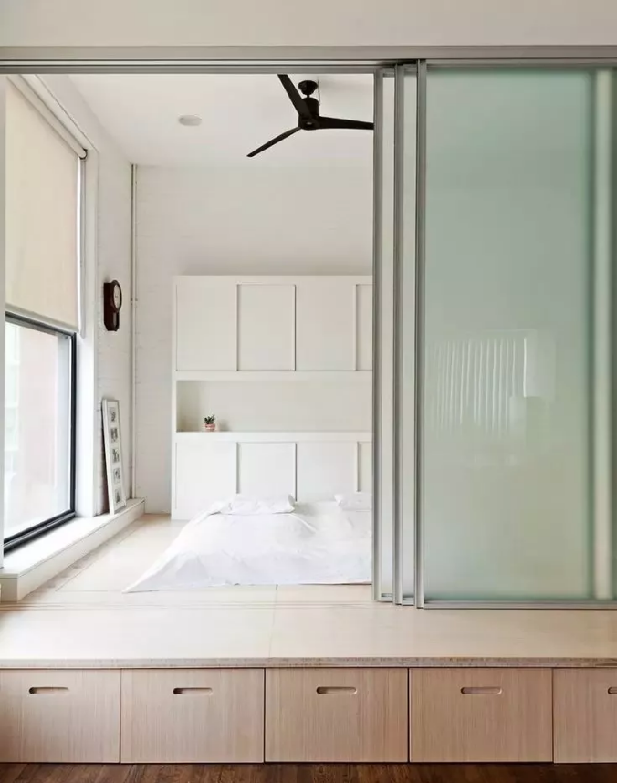 所以也有許多的屋主會選擇把整個房間給改成榻榻米地臺,這樣收納和安全性都有,把床給放在榻榻米地臺的一角,也會影響底部收納空間的使用。