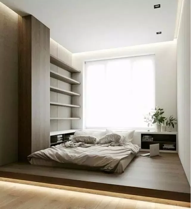 還可以在榻榻米地臺的下方加上燈帶,更加帥氣。這樣的榻榻米地臺上方空間也可以做一些隔板來收納,代替床頭柜的功能。