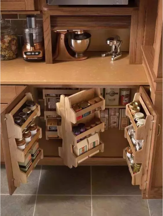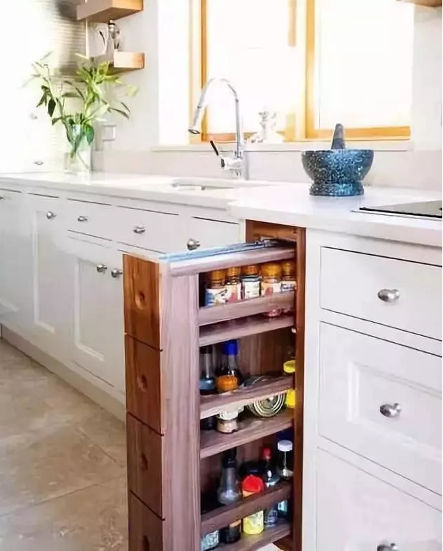喜歡烹飪的人,家里應(yīng)該都會有較多的調(diào)味料,這些小瓶瓶罐罐多了,操作臺就很容易顯得雜亂,這個時候就有必要在櫥柜里留個拉籃了。
