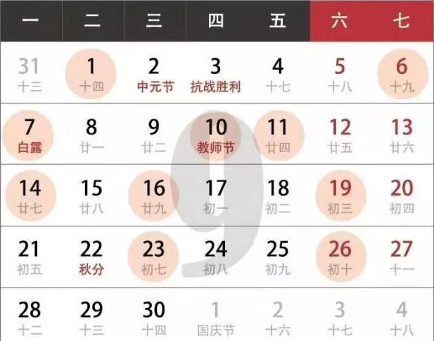 7.公歷2020年10月30日,農(nóng)歷二零二零年九月十四,星期五;