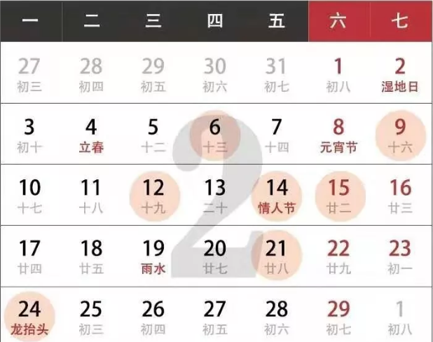7.公歷2020年2月24日,農(nóng)歷二零二零年二月初二,星期一;