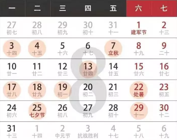 7.公歷2020年8月19日,農(nóng)歷二零二零年七月初一,星期三;