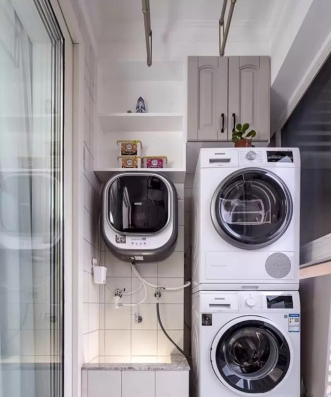 陽臺的其中一側(cè)空間被充分的利用起來,洗衣機、烘干機疊在一起擺放,洗手臺的上方還有這一個嬰兒洗衣機,上方同樣有著吊柜。