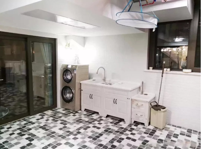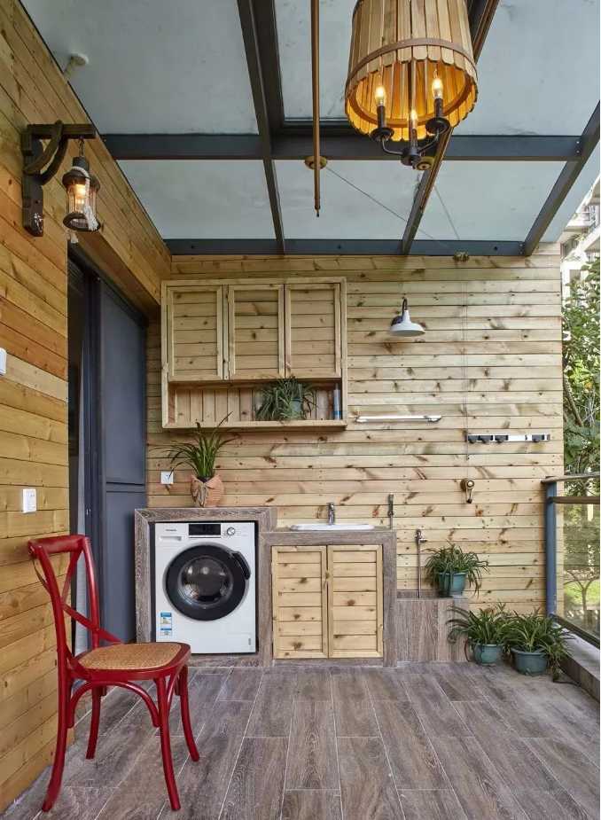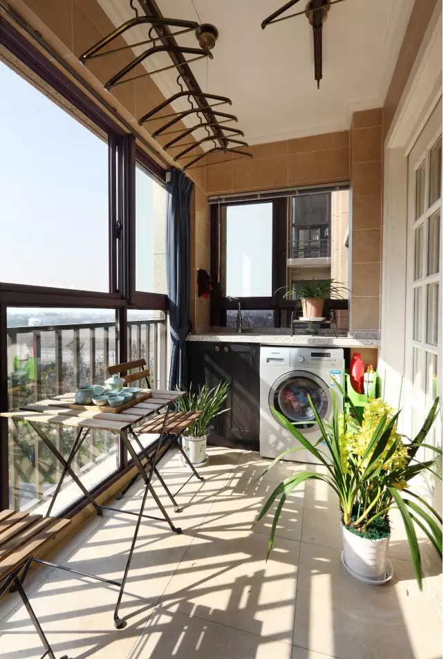 還有一些家里陽臺是屬于露臺的戶型,那么空間就更為充足了,洗衣機、洗手臺和柜子都可以擺放得更為隨意一些,留空的區(qū)域也可以作為休閑區(qū)來使用。