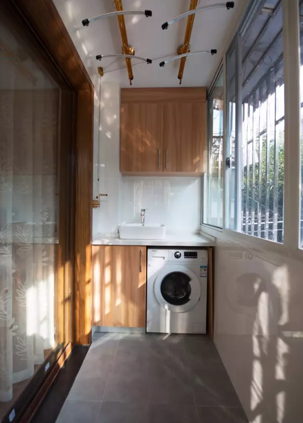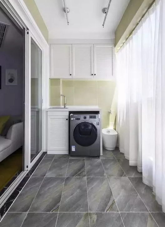 就算陽臺的面積比較小也可以做洗衣機加洗手臺和吊柜的設(shè)計,把洗手臺放在靠近室內(nèi)的這一側(cè)墻面,構(gòu)成一個L形的格局。