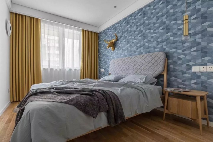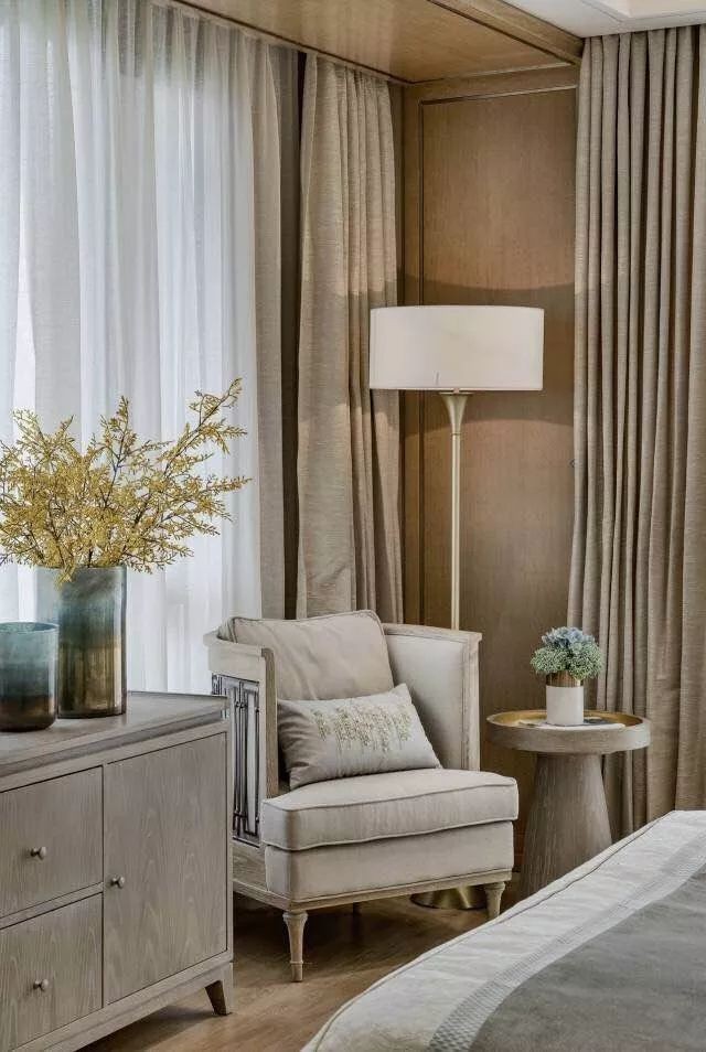 色彩方面不宜大面積的使用高飽和和高對(duì)比的顏色,面料盡量選擇厚實(shí)有質(zhì)感并且遮光效果好的,如果單層布料不能滿足遮光要求,加上一層襯布不僅可以提升遮光效果 同時(shí)還具備保溫隔音的效果,有效提升房間的舒適度。