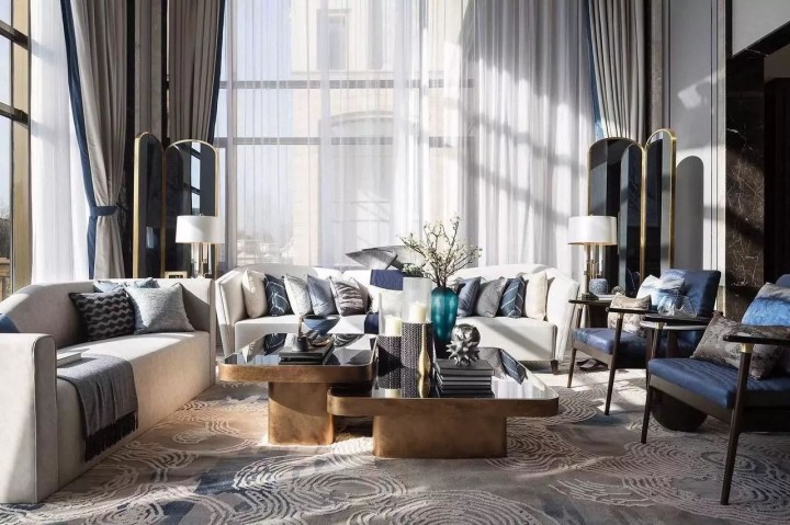窗簾色調(diào)應(yīng)與家具及飾品協(xié)調(diào)搭配,營(yíng)造和而不同的層次感,注重面料的質(zhì)感與垂感,這樣就可以營(yíng)造出一種莊重簡(jiǎn)潔、大方明亮的視覺效果。