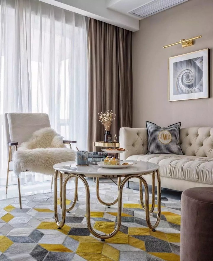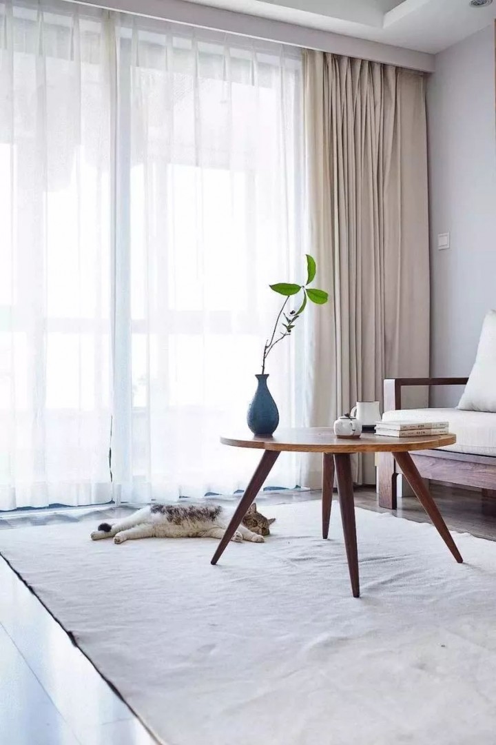 用窗簾呼應(yīng)地毯、沙發(fā)等其它軟質(zhì)家裝的色感,是簡(jiǎn)單又保險(xiǎn)的做法