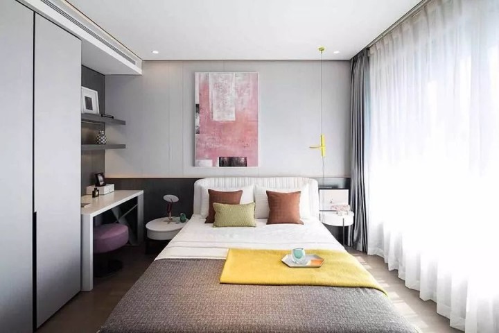 高級(jí)灰自帶現(xiàn)代味,天生一副文藝感爆表的“高冷范”。整體簡(jiǎn)潔純粹,以免多色間爭(zhēng)奇斗艷,帶來躁動(dòng)感。用窗簾呼應(yīng)地毯、沙發(fā)等其它軟質(zhì)家裝的色感,是簡(jiǎn)單又保險(xiǎn)的做法。