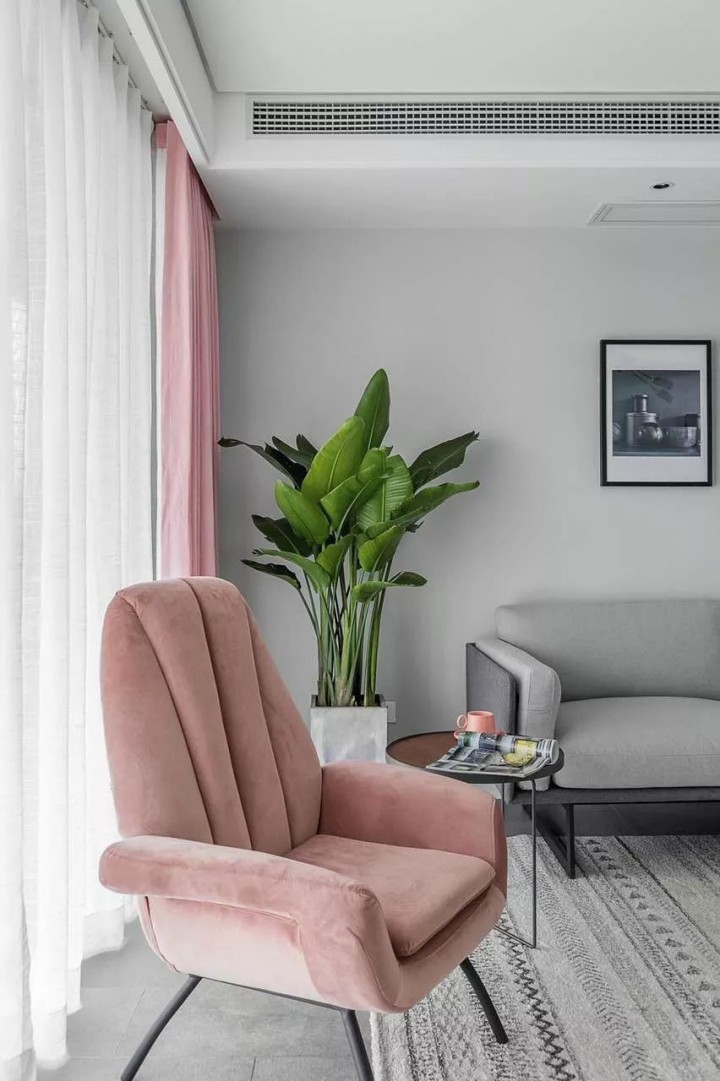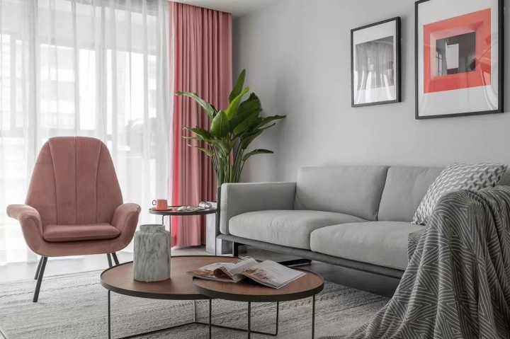 窗簾的粉紅既不花哨又不會(huì)單調(diào)無趣,且與灰色沙發(fā)、木紋茶幾融成一個(gè)十分和諧的視覺整體。