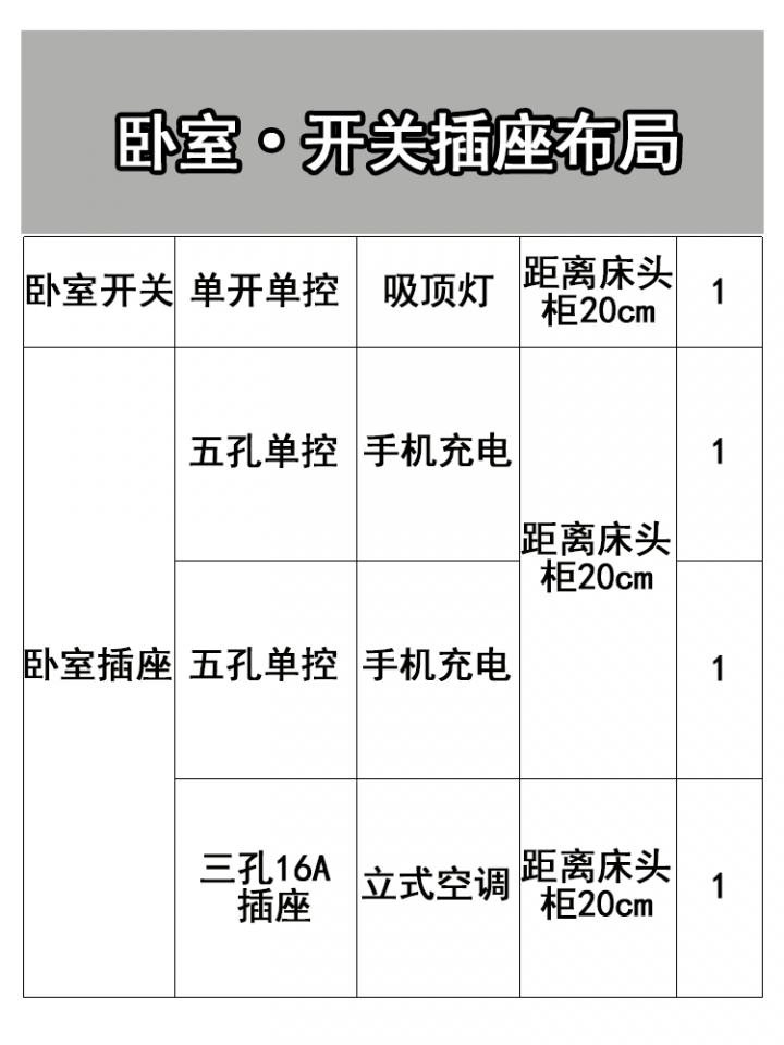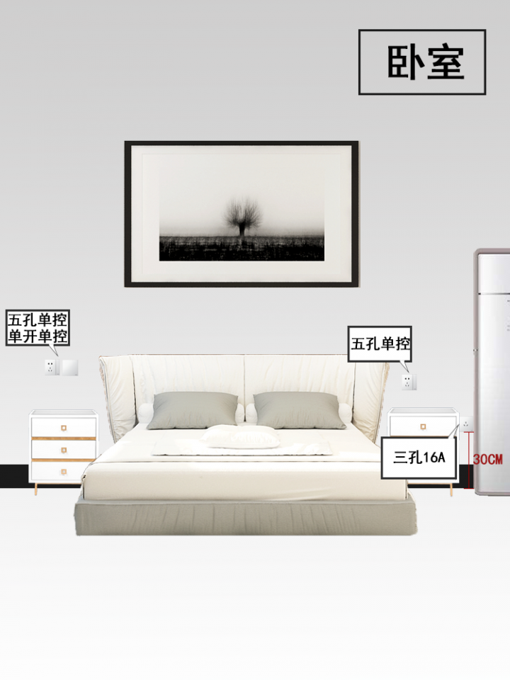 五孔單控插座2個,放在床頭柜上方30cm,16A三孔插座1個,立式空調(diào),距離地面1.3m