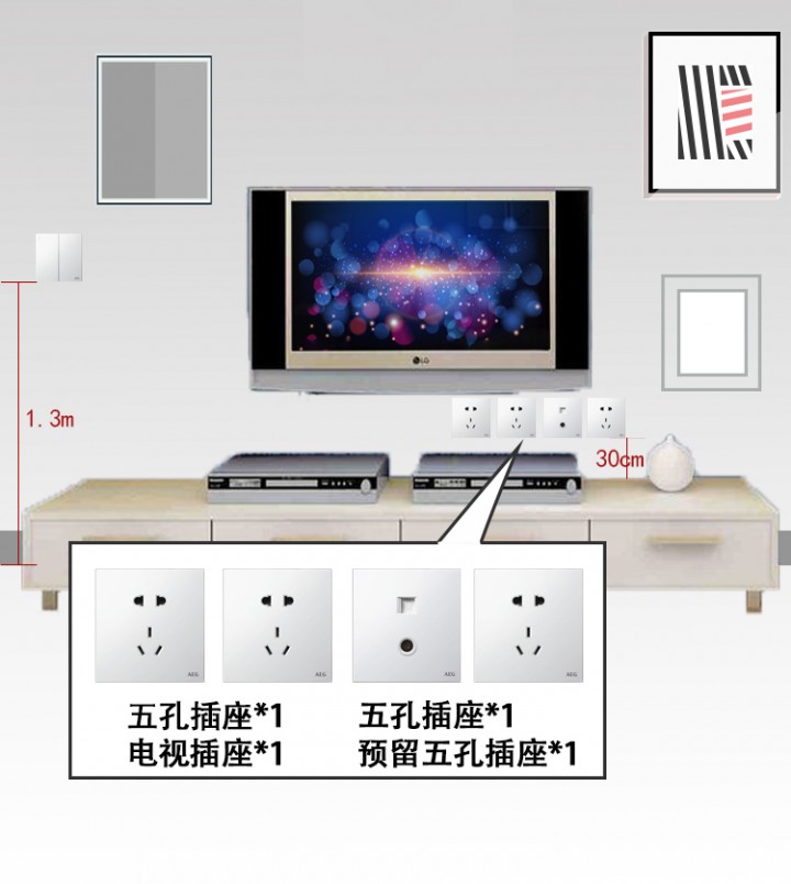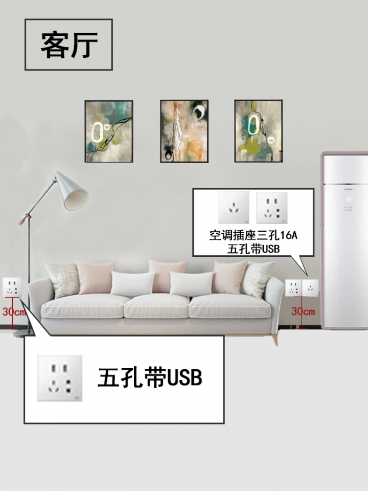 雙控開關/三控開關負責吊燈、燈帶、光圈 五孔插座3個,電視柜下方電視插座1個,電視柜下方五孔帶USB2個,16A三孔插座1個空調(diào)插座