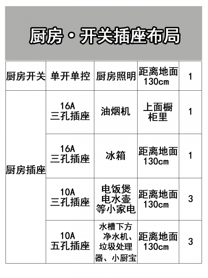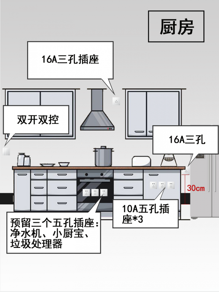 16A三孔插座2個,油煙機和冰箱,油煙機插座放在上方櫥柜里、冰箱插座距離地面30cm ,五孔插座6個,櫥柜下方3個,操作臺上方3個