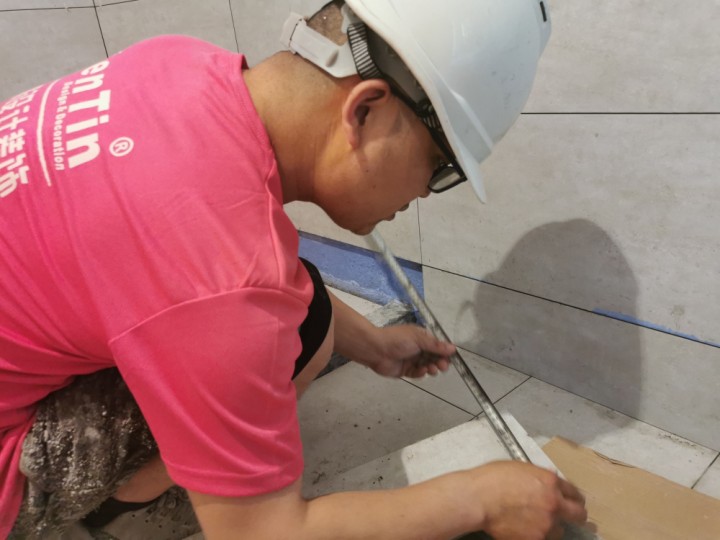 在施工里魏師傅和戴姐專門負(fù)責(zé)貼磚,夫妻之間的默契讓他們的工作流程十分流暢,戴姐負(fù)責(zé)核對(duì)尺寸、切割材料,魏師傅負(fù)責(zé)拼貼,整個(gè)流程行云流水一氣呵成,效率和品質(zhì)都非常高。
