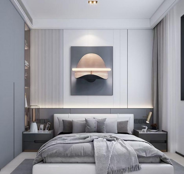 床頭的話,可選擇方式比較多,看自己喜好,可以是整面木飾面、可以是半墻設(shè)計,底部木格柵拼接乳膠漆的方式。但不管哪里,建議同樣要加入燈帶、線條燈進(jìn)行點綴。