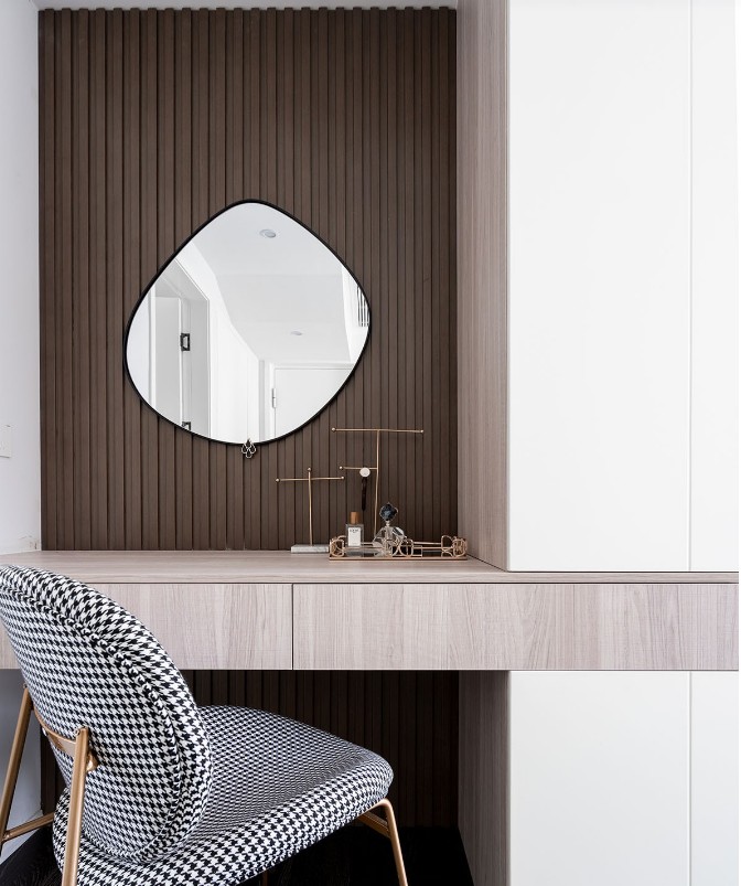 臥室這區(qū)域不管是書桌還是梳妝臺,空白的墻面最好做一下木飾面上墻,可以防止底部你腳不小心踩的都是印子。