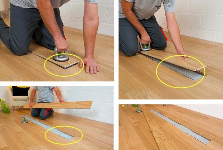 木地板卡扣式安裝,從上圖可以大體看出流程了。安裝時,確定地面平整后,就可以將不銹鋼卡扣鋪到地面上面去,無需固定,然后就可以將一片木板底部的卡槽插入卡扣當(dāng)中去了,顯得非常的輕松。