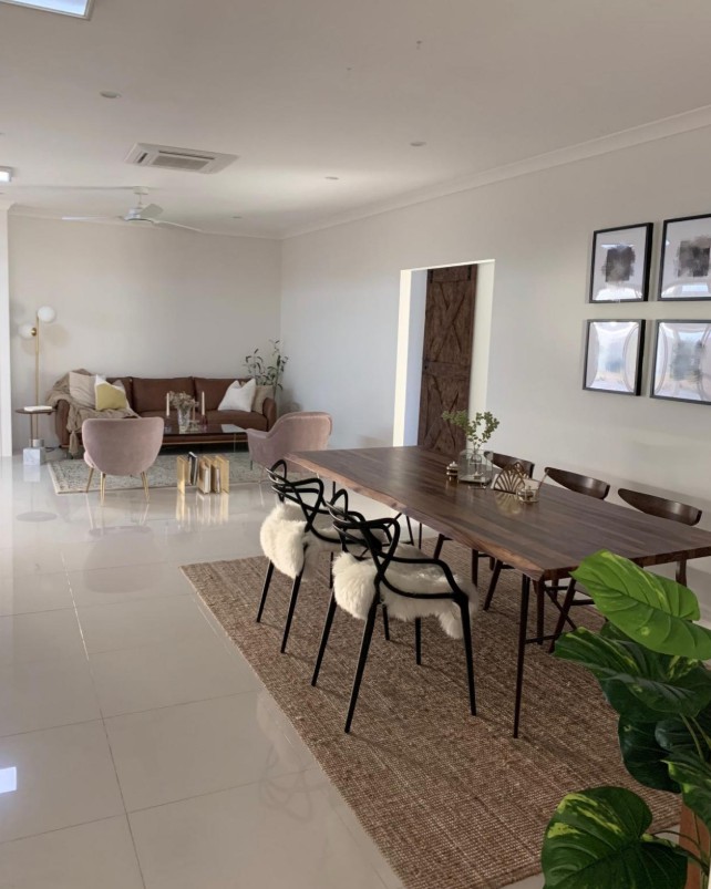 高腳長方餐桌,更適合這個極簡的家居風(fēng)格,地面上鋪的地毯亞麻質(zhì)地,營造自然純樸的就餐環(huán)境。