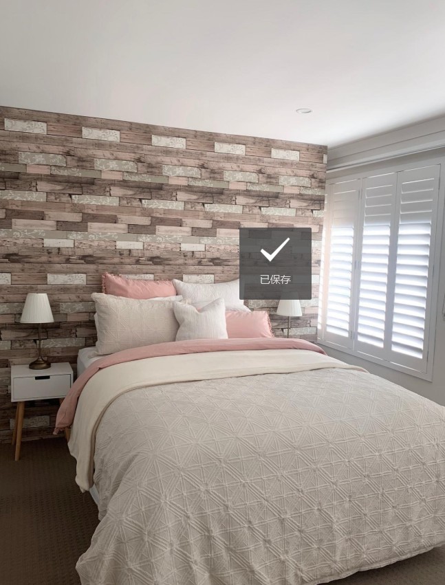 背景墻上是仿木板拼接的墻紙,和周圍的白墻區(qū)分開來,成為整個屋子的重點。軟糯的粉色床品讓臥室看起來溫馨浪漫。