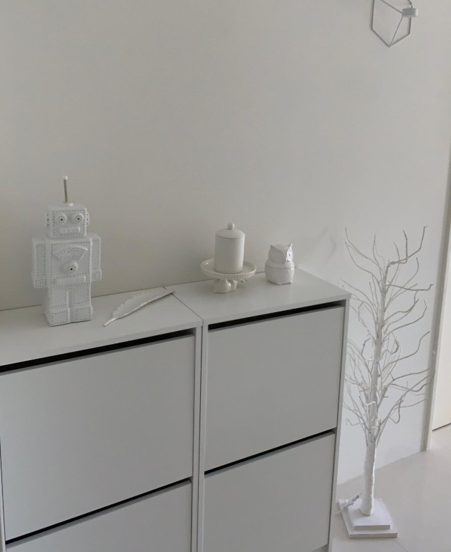 再往里可以看到一個半墻高的收納柜,下層用于收納鞋子,臺面上擺放裝飾品,十分有格調(diào)。