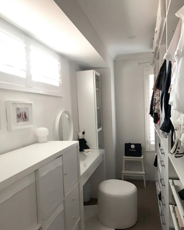 衣帽間和臥室相連,分別設(shè)計有衣服,包包,鞋子的收納格和梳妝臺。