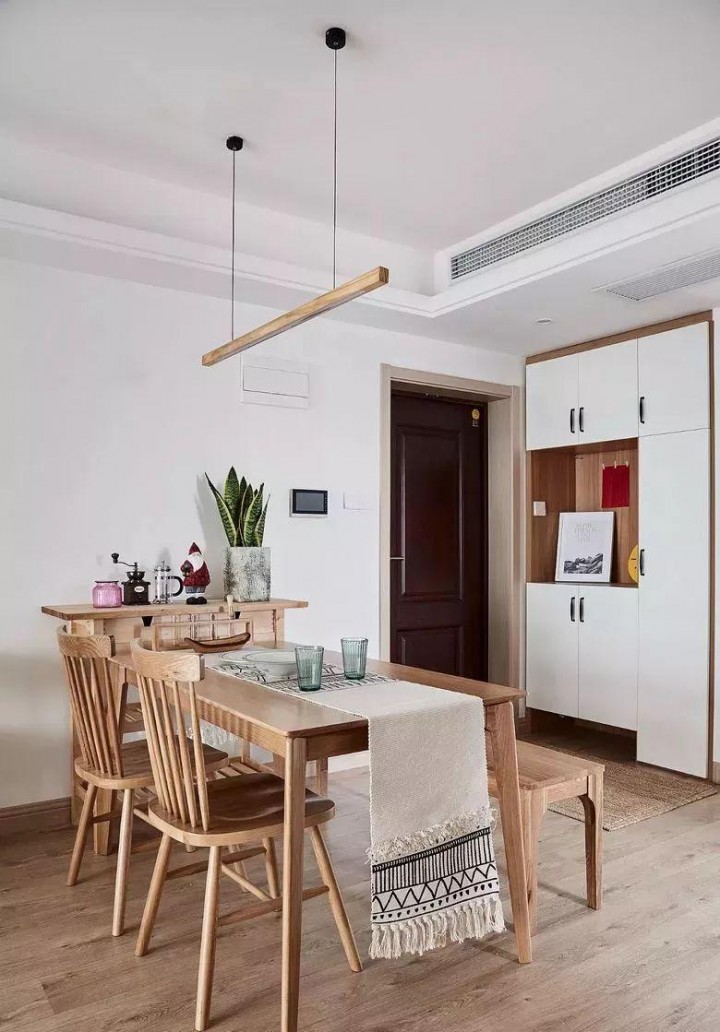 進(jìn)門正對(duì)餐廳無玄關(guān)設(shè)計(jì),對(duì)于那些不足80平的房子,時(shí)常會(huì)碰到玄關(guān)太小或者無玄關(guān)的問題。這時(shí)候,鞋柜該放在哪里合適呢?這時(shí)候這種組合式設(shè)計(jì),就很值得借鑒。玄關(guān)柜+餐邊柜同處于餐廳空間,綜合性能更強(qiáng),發(fā)揮雙重作用,誰能不愛呢!