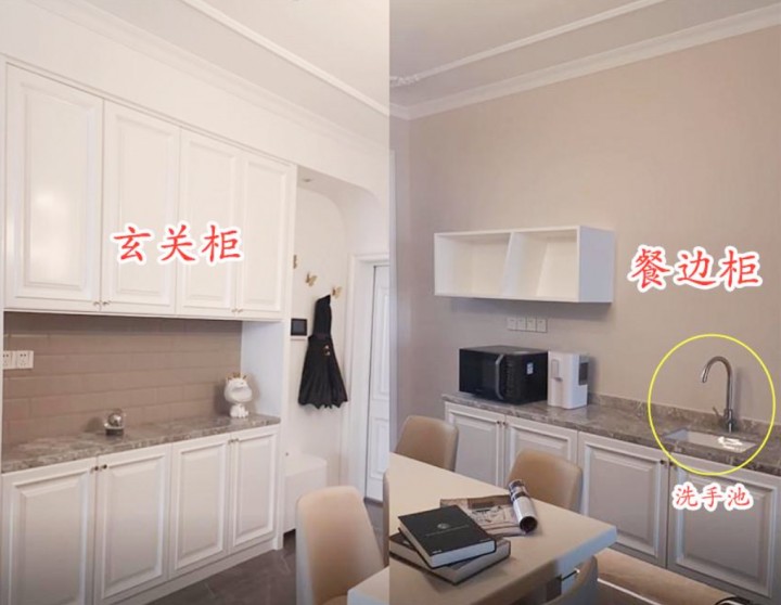 跟第一種設(shè)計(jì)一樣,需要餐廳的空間要比較大,玄關(guān)柜、餐邊柜、餐桌椅形成分離式布局。有需求的話,可以加上一個(gè)洗菜/洗手池,日常也可以在這邊備完菜,再拿進(jìn)廚房。