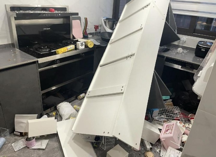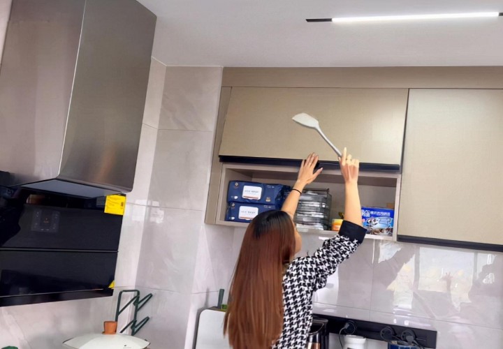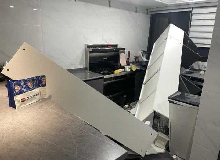 網(wǎng)友的廚房不想破壞墻面,就采用了新式吊鉤安裝方式。結(jié)果半夜整個(gè)柜子都倒了。