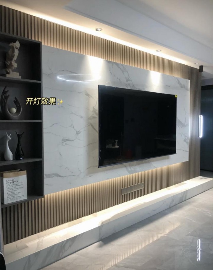 繼隱形格柵門之后,一種新型格柵電視背景墻最近開始流行。配合大理石背景和75寸的壁掛電視,整體效果真的很美。