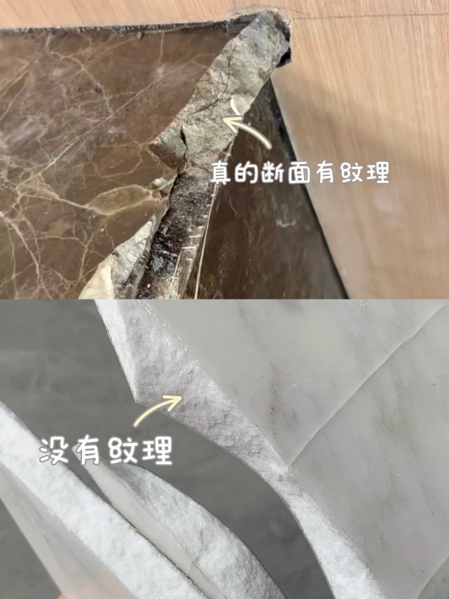 這里需要注意:①甄別大理石真假:通過看大理石斷面巖石細(xì)密程度,真的大理石斷面是富有紋理的;