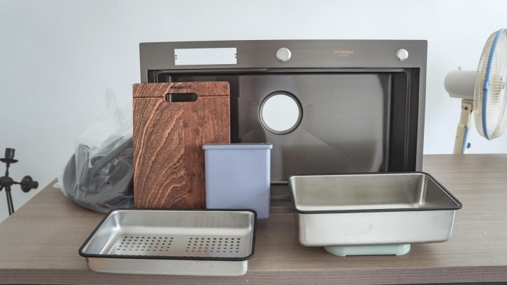 雙階梯結(jié)構(gòu)是我第一次接觸,砧板和另外兩個(gè)水盆位于不同高度放置可以做到互不干擾,進(jìn)一步節(jié)約了臺(tái)面空間,同時(shí)這一趟也可以讓這個(gè)龐大的單槽變身雙槽,可以根據(jù)自己的需求進(jìn)行搭配使用。