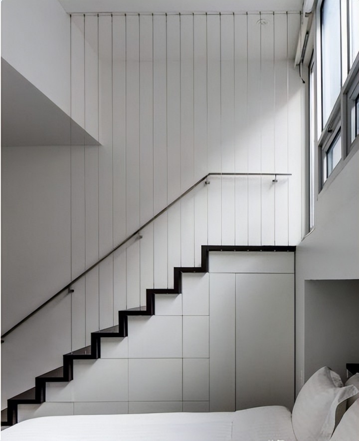 跟上面有異曲同工之妙,將用來封陽臺(tái)的隱性防護(hù)網(wǎng)用在室內(nèi),代替樓梯扶手起到基本的保障作用,只不過實(shí)際操作時(shí),要注意中間的間距,這點(diǎn)是需要提前確定好的。