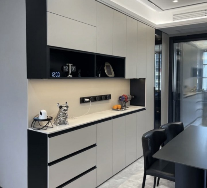 餐邊柜中間的空格處,可以安裝3-4個插座,以后像燒水壺、破壁機、咖啡機等小型家電就可以直接插電在此工作使用,不用再麻煩搬到廚房了。