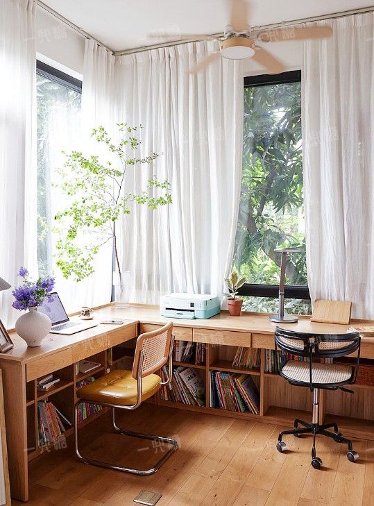 當(dāng)然,享受了窗前的通透感同時(shí),別忘了裝上窗簾,畢竟太陽過大,讀書、辦公起來也是非常不舒適的。
