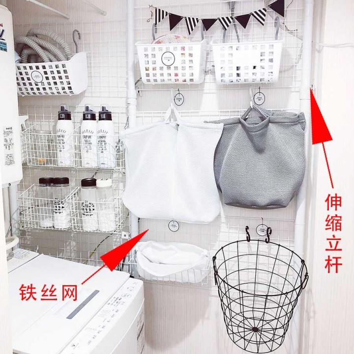 如果洗衣機旁有縫隙空間,以前的做法是使用帶輪的縫隙柜,但上方的空間就浪費了;因此,有些日本 主 婦組合了伸縮立桿及鐵絲網(wǎng),并靠墻壁放置;這時候只要放上S形掛鉤或小型吊籃,就能收納更多清潔工具。
