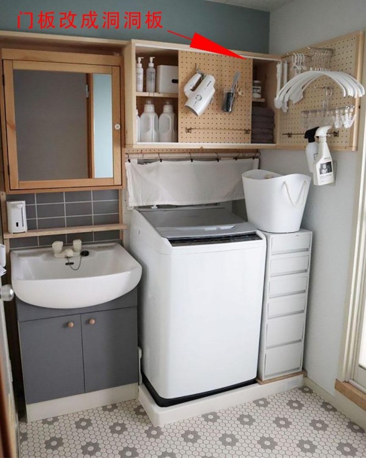 將常用于廚房的吊柜安裝在洗衣機上方,也是好方法!而且?guī)чT板的柜體,還有整齊空間的作用。但好玩的是,日本友人將門片換成洞洞板,并在墻邊再加裝一塊洞洞板,搭配掛鉤,能收納物品更多了。