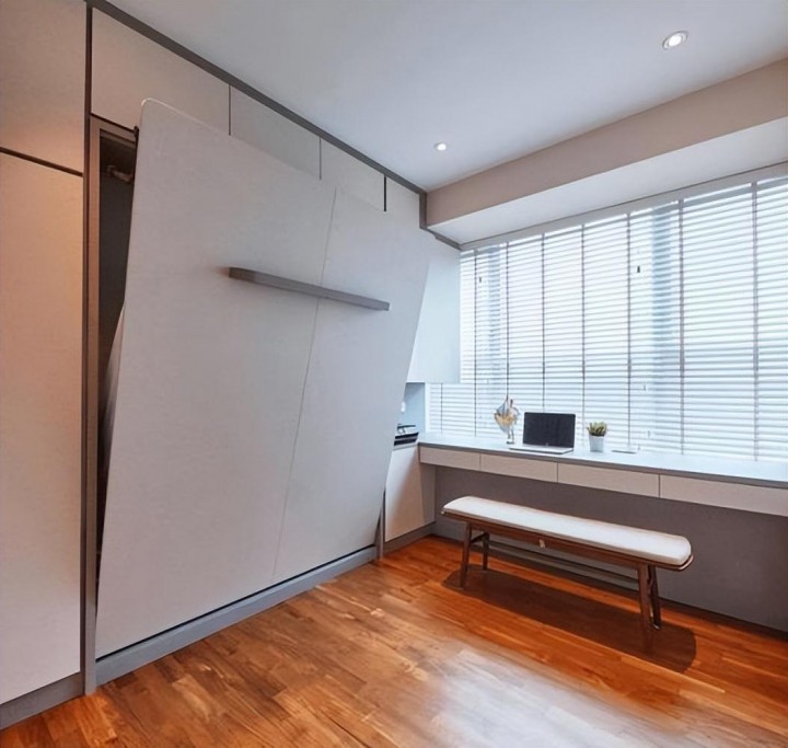 墨菲床就是隱形翻床,在平時不用的時候可以翻轉(zhuǎn)起來和柜子融為一體,在用的時候只需要將其放下來,就可以變成一個床鋪了。