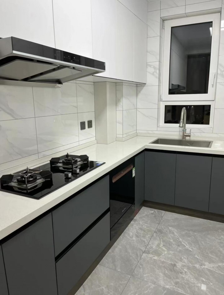 淺灰色的地磚+灰色地柜+白色吊柜,這樣一灰一白的配色被石英石臺面分割開來,顯得格外分明。