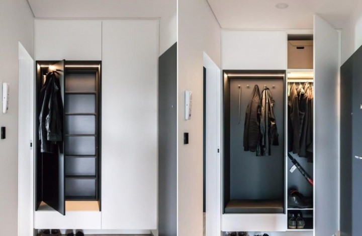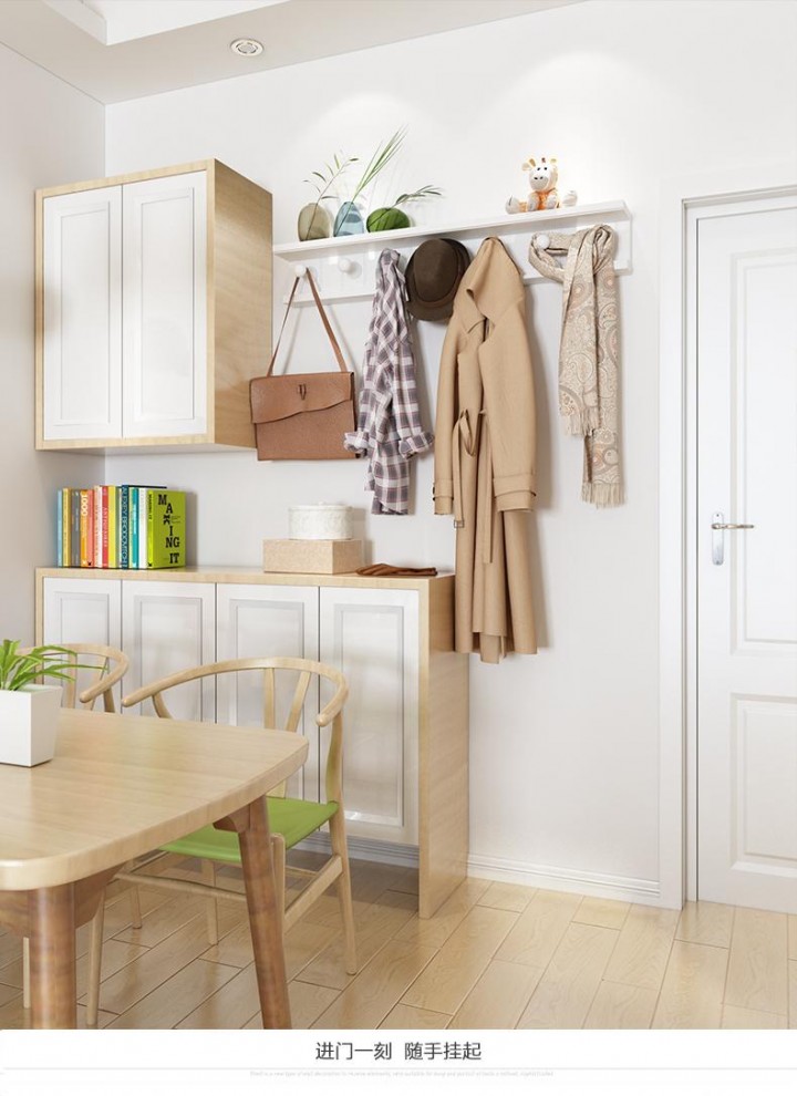 最理想的是一個帶柜門的掛衣區(qū),外加開放式的幾個掛鉤。這樣,衣物掛多了,也不會顯得亂,而且外面的掛鉤用于掛包包,鑰匙也方便。