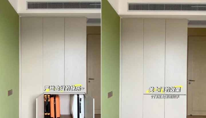 衣柜選擇分段式設(shè)計(jì),并不建議頂部加柜,而是將上面部分,挪到底部。如上圖這樣,柜門關(guān)上嚴(yán)絲合縫,我們利用這地方用于一些被褥放置或者行李箱的放置,都比柜子在上方來的方便。