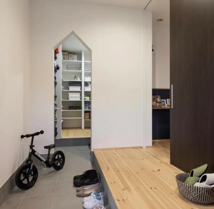 日本的房子,除了在入戶的地方做了下沉式玄關(guān)外,還會在旁邊做個儲物間,用來放鞋子、運(yùn)動用品、嬰兒車、雨傘、工具、快遞等雜物。