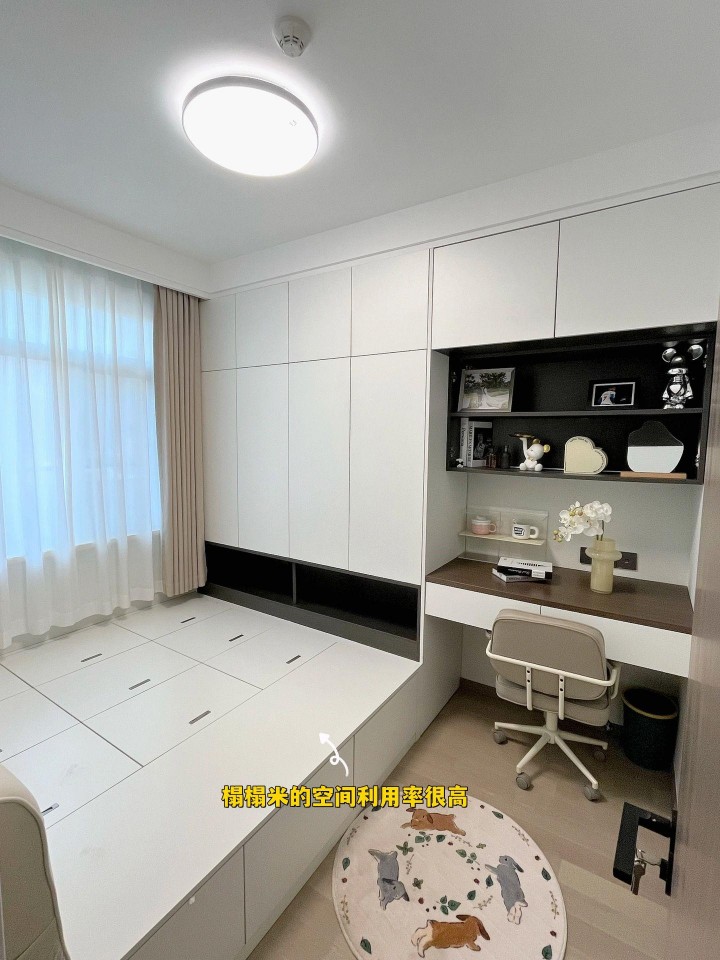 塔塔建議:臥室面積小不一定要做榻榻米,只要是定制家具都能提升空間利用率。建議大家定制框架床,床架和地面之間留出50cm高度,這部分空間可以用收納盒來放一些雜物,比榻榻米用起來更方便。