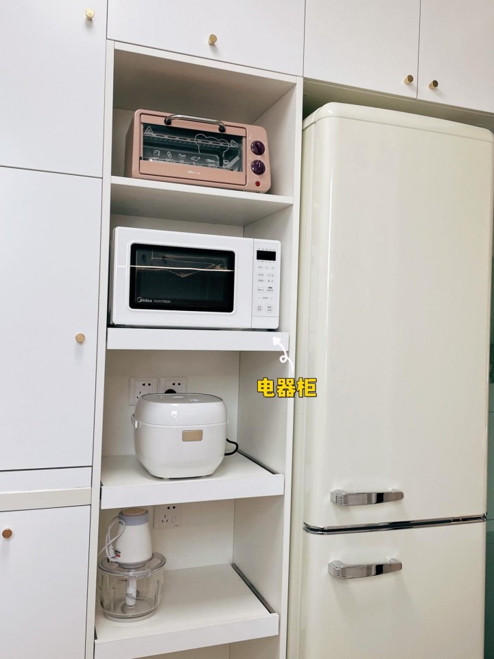 電器柜就是一個不錯的選擇,每一層柜格的高度做到40cm,層板建議做抽拉式設(shè)計,使用電器時把層板抽拉出來,避免水蒸氣損害櫥柜。