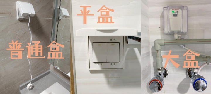 衛(wèi)生間里的所有開關插座,都需要安裝防水盒。開關建議選平防水盒,不會向外突出,視覺感、空間感都要更好一些。