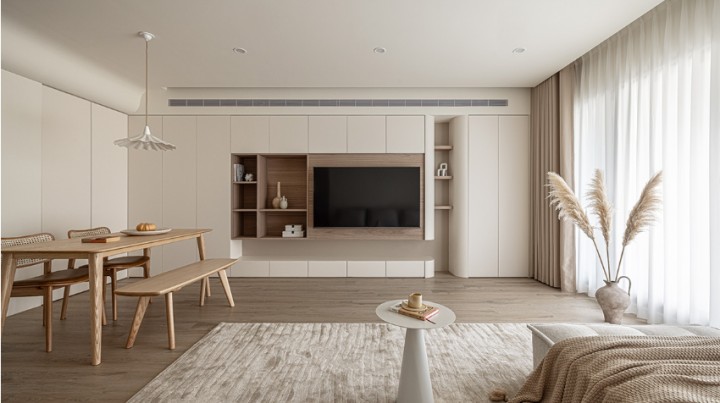 開一扇窗,創(chuàng)造意想不到的趣味構(gòu)圖,也牽引了絕佳穿透感,無阻的光跡流竄劃過以浪漫為名的家宅。從現(xiàn)代簡約的大方向中,漸漸透出清晰的柔美調(diào)性,沒有過多鮮艷色彩,以柔白輕淺披覆、借藤質(zhì)畫龍點睛,萃釀出微甜不膩的柔婉風(fēng)范。