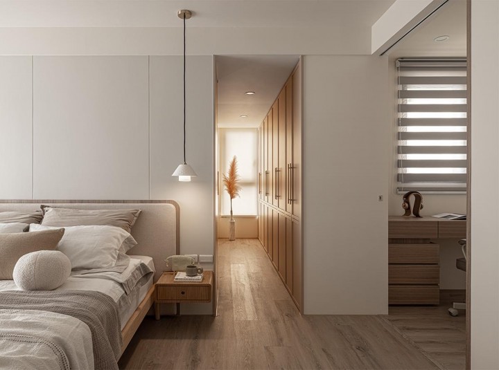 床頭右側(cè),規(guī)劃了小型書房以及一字型衣帽間,滿足日常辦公以及收納需求。一道橫拉門輕巧分隔睡眠空間和書房,靈活又實用。
