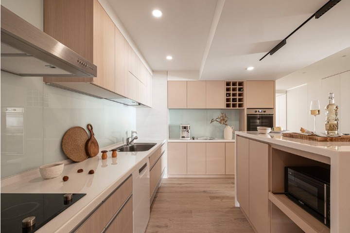 廚房加入了人造石中島臺設(shè)計,除了可以塑造回形動線設(shè)計,還拓寬了廚房操作空間,也便于小家電的收納。